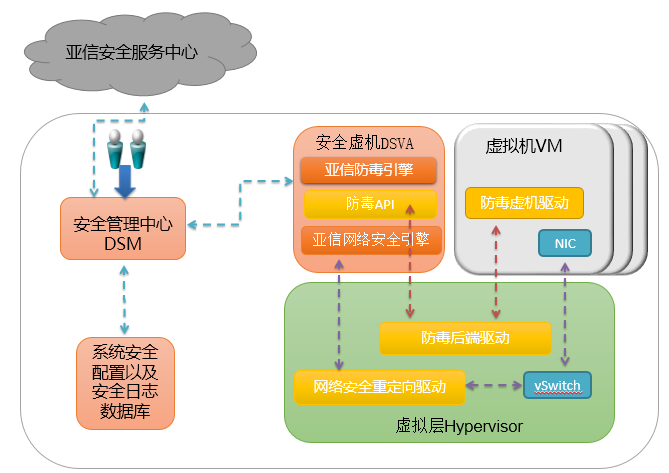 传统方法是在虚拟化环境中通过在每台虚拟机操作系统上安装防病毒客户端的方式进行病毒防护,从资源占用方面考虑存在一定安全风险。由于每个防病毒客户端都会在同一个物理主机上产生资源消耗,并且当发生客户端同时扫描和同时更新时,资源消耗的问题会愈发明显,严重时可能导致服务器宕机。
